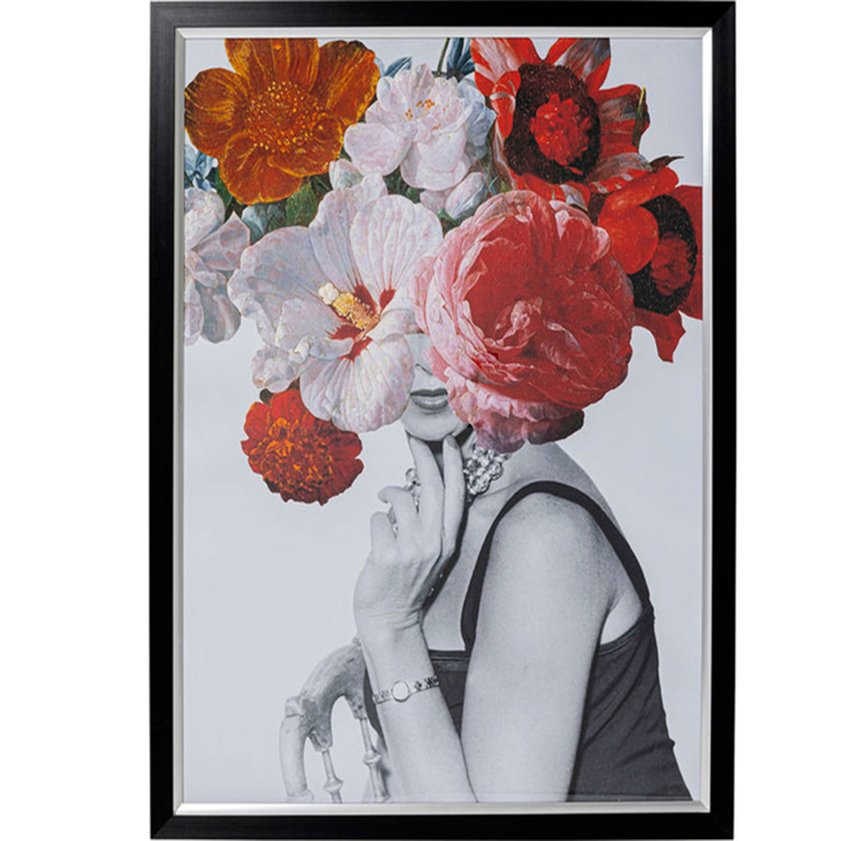 Декоративное панно большого формата, с необычным и загадочным принтом, на котором изображена девушка в черно-белой цветовой гамме с цветным акцентов в виде большого букета цветов на голове пастельных тонов.