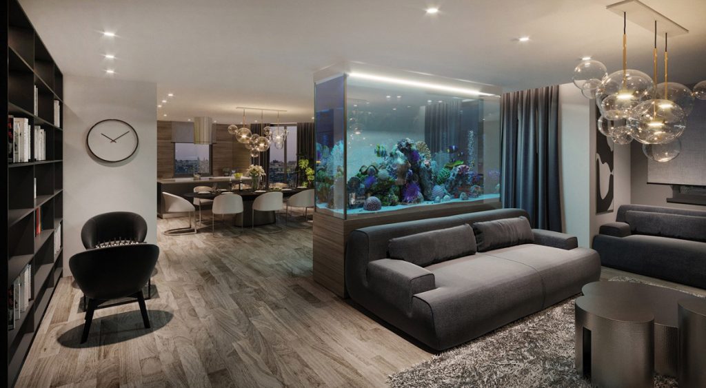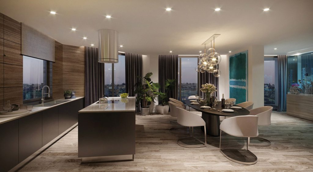 Пространство получилось открытым. Зоны плавно перетекают друг в друга, создавая гармоничный альянс, а большие окнавитражи позволяют насладиться городской панорамой. Этот проект создавался для молодой семьи, любящей принимать гостей и проводить время с друзьями.