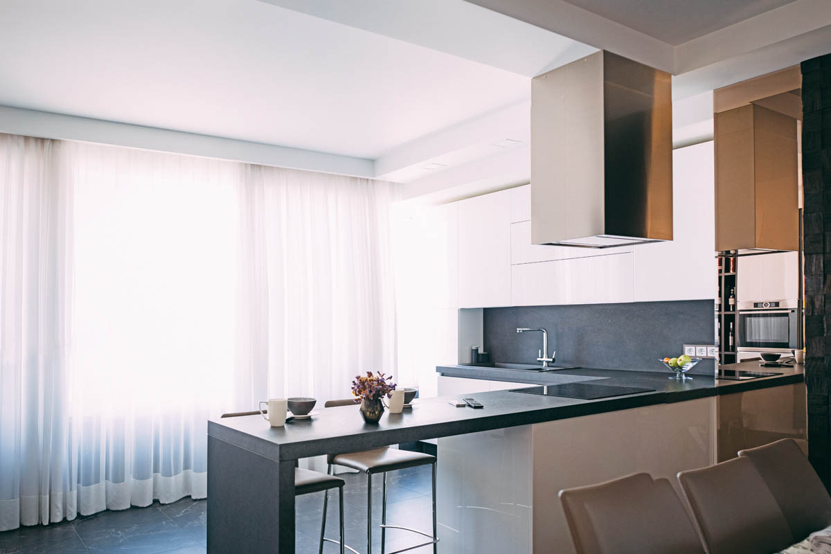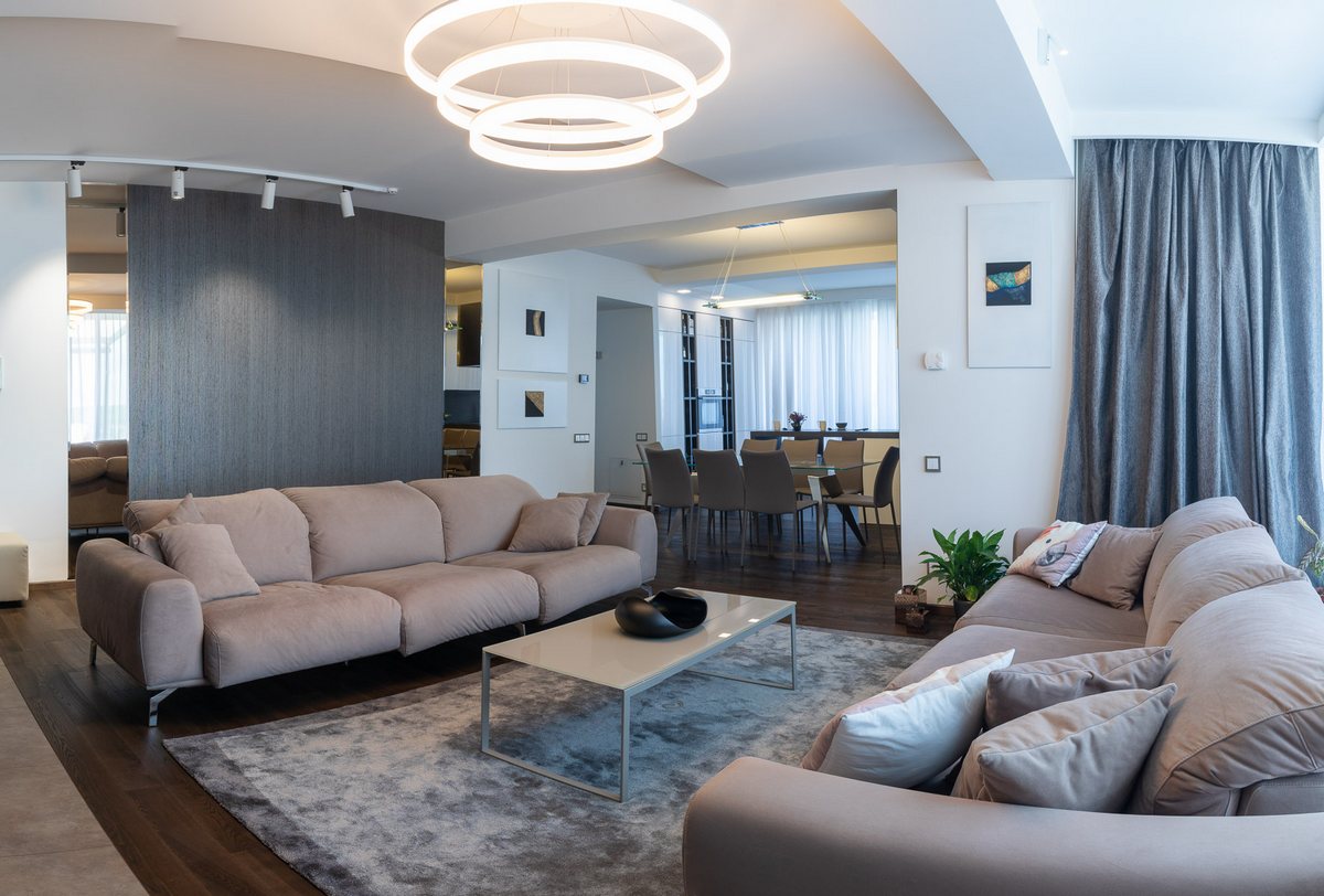 «Помимо этого, передо мной стояла задача сделать квартиру визуально больше, потолки  –  выше, а стены и углы – ровнее»,  – говорит автор проекта Анна. Лёгкая, современная, снимающая напряжение и настраивающая на отдых – именно такая квартира нужна была заказчикам.