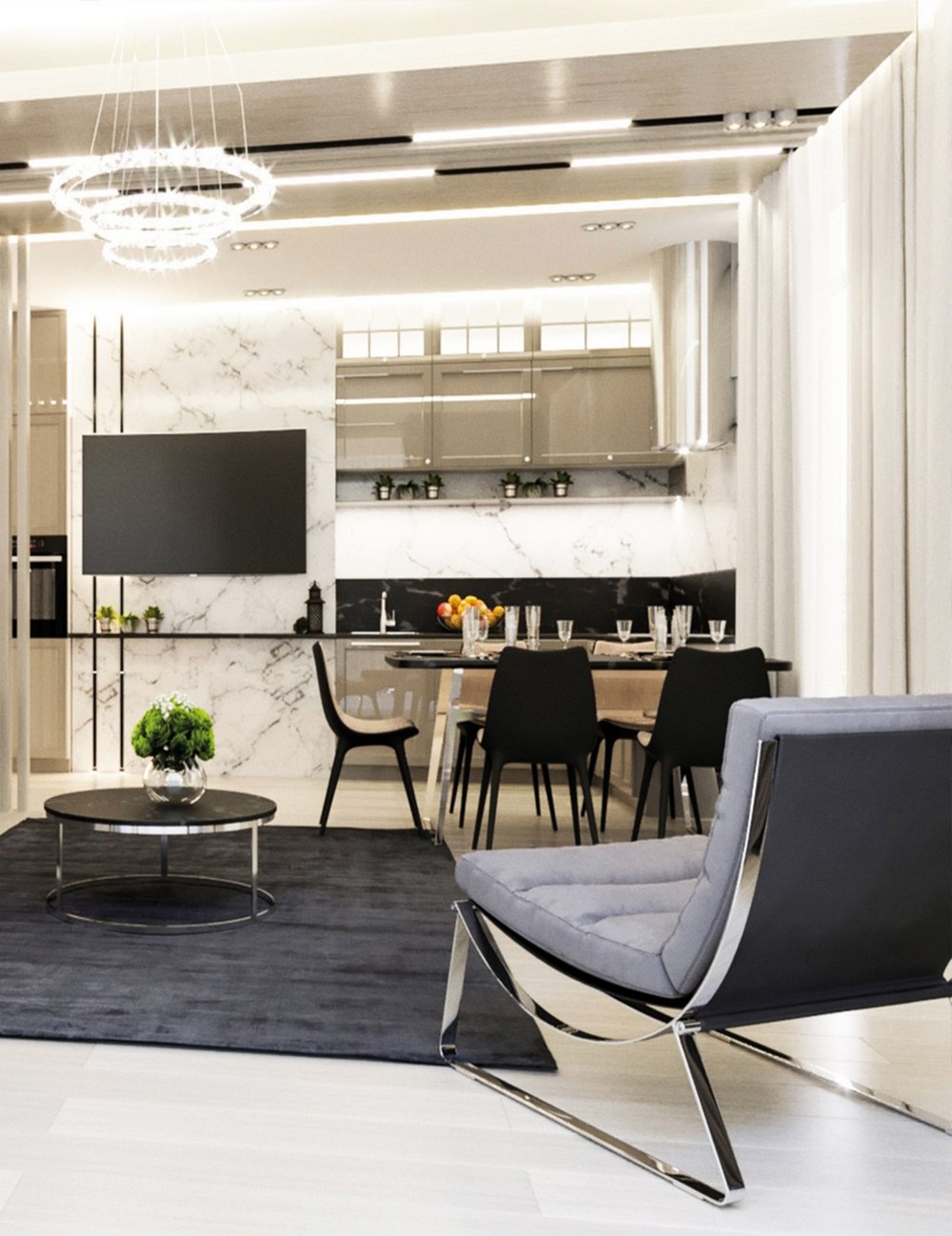 Освещение Wolfram Light Studio споты Nowodvorski модель EYE white, STRAIGHT LED GRAPHITE CEILING M; люстра Eglo модель PENAFORTE 39274; торшер Flos модель IC Lights; встроенный свет в стены Artemide Algoritmo System модель Diffused Emission