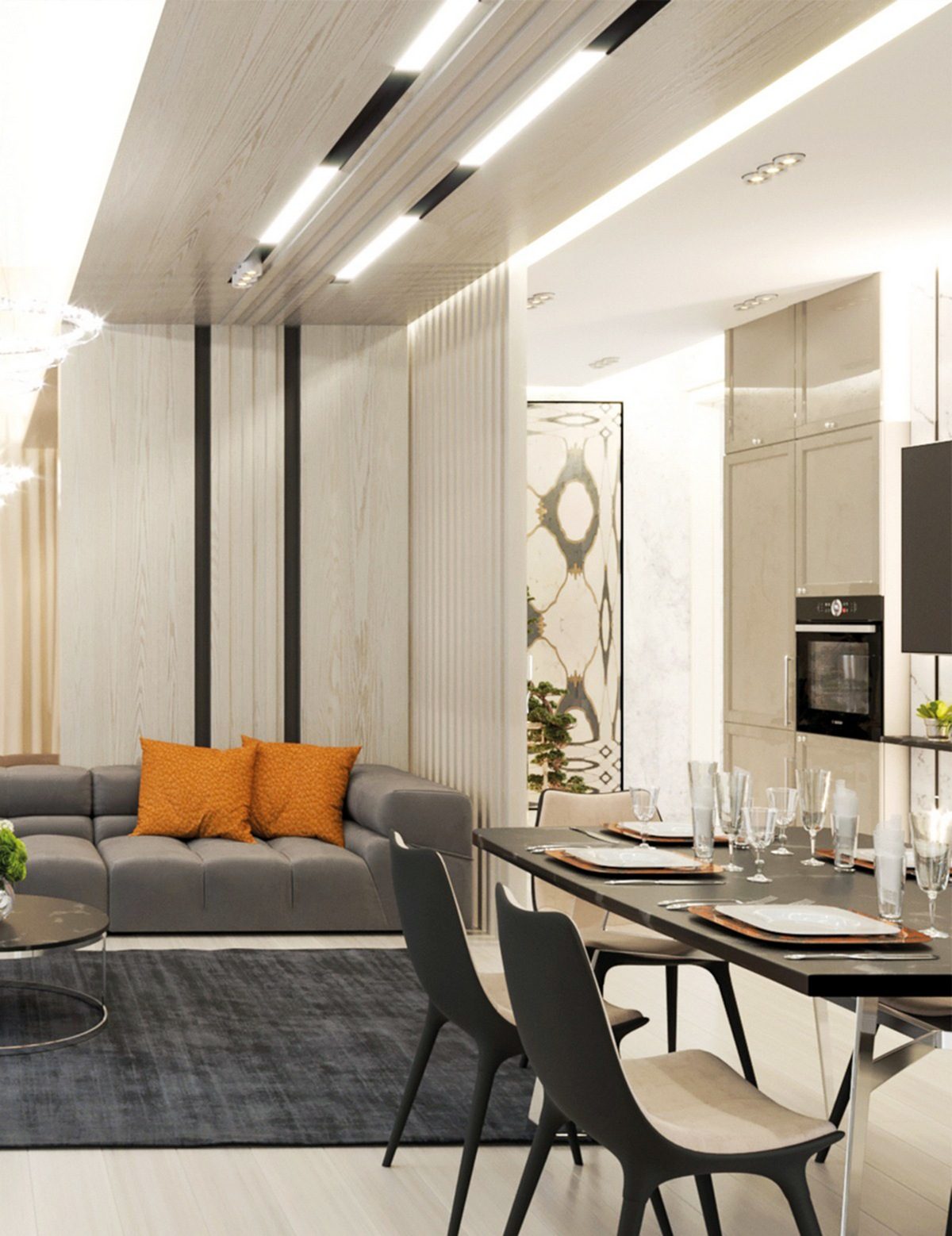 Создавая этот проект, дизайнер проектировала, прежде всего, комфортное и уютное пространство. Функциональность и безупречность стиля модерн идеально соответствовали настроению интерьера. Елена Яниогло поддержала спокойную цветовую гамму интерьера натуральными материалами.