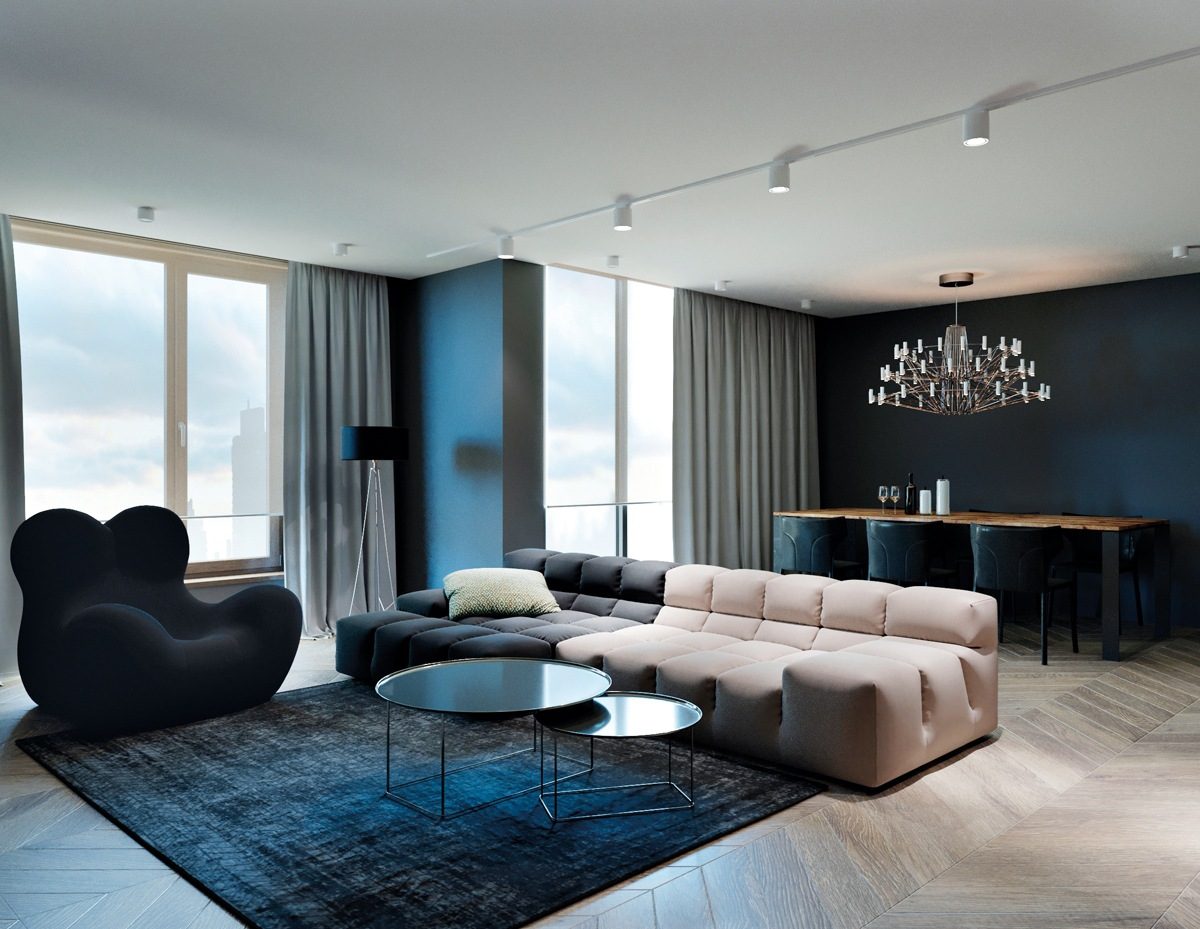 Дизайнеру удалось спроектировать гармоничное пространство, лишенное суеты и наполненное комфортом. Современный стиль в сочетании с элегантностью и элементами минимализма пробуждает фантазию, поэтому подойдёт для молодых и динамичных жильцов.