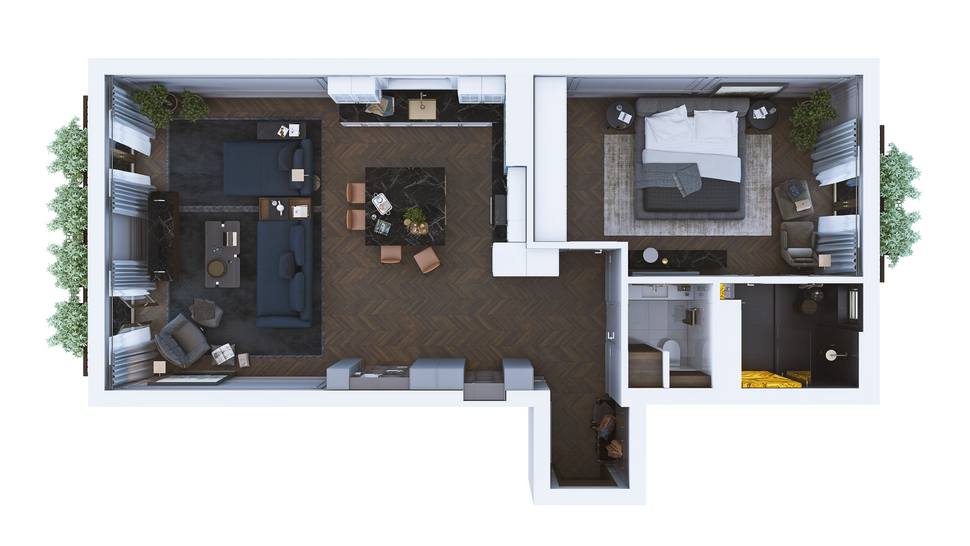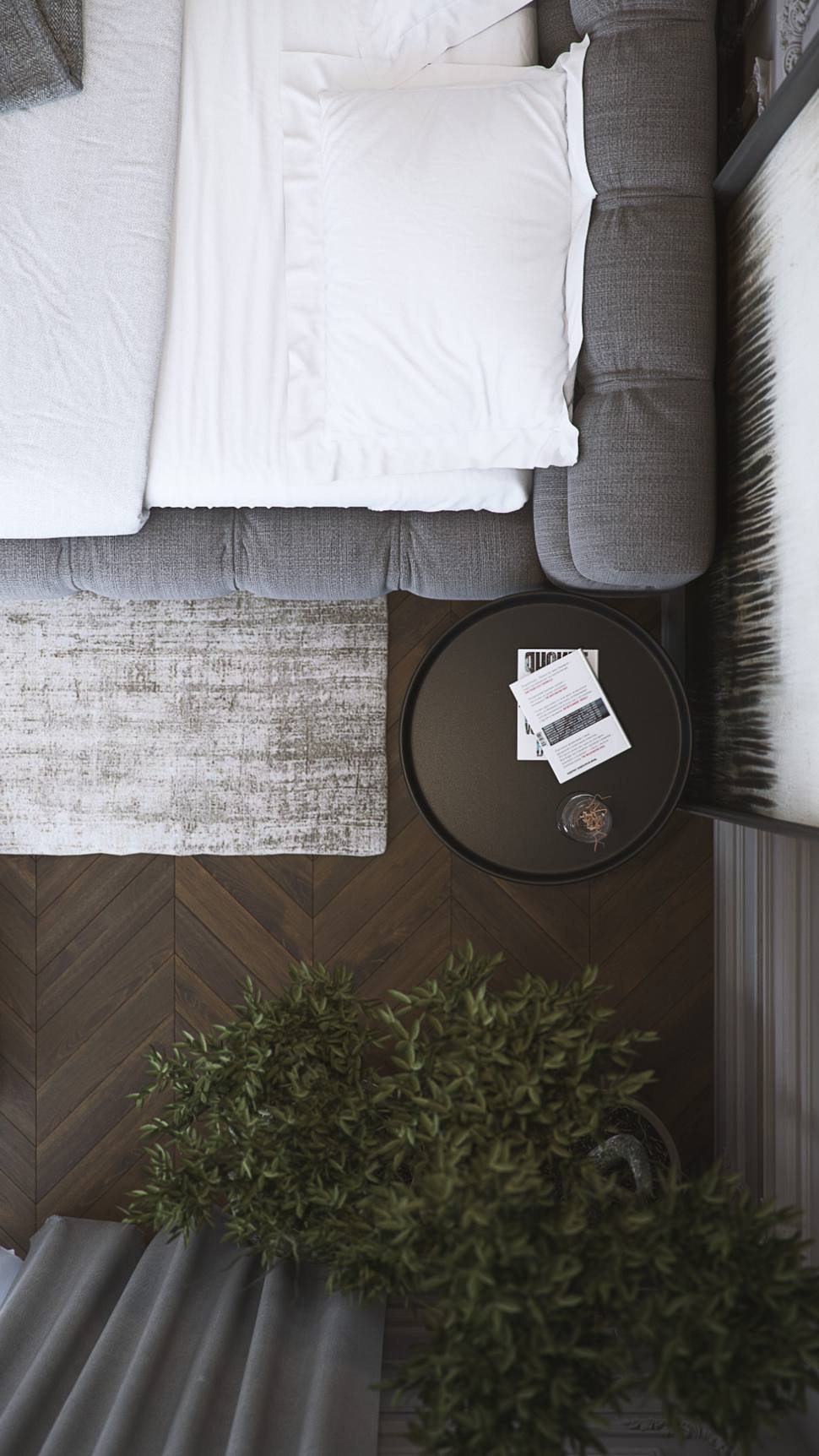 Самым ярким акцентом является светопропускающая ониксовая плита с LED-подсветкой, которая установлена в ванной. В проекте отсутствует обеденный стол, так как владельцу он не нужен. Вместо этого есть большой кухонный остров, который также служит барной стойкой. Нельзя не отметить милые балкончики в гостиной и в спальне с прекрасным видом на город.