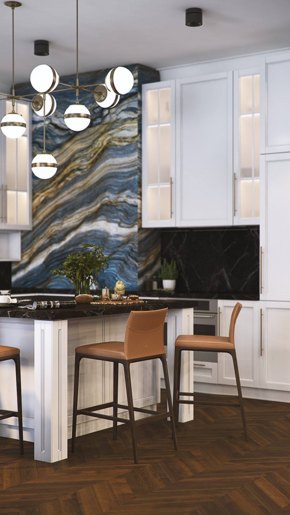 Богатая текстура синего оникса – настоящий шедевр, который задает тон всей квартире. Дневная зона организована в просторном open-space, объединив прихожую, кухню и гостиную. Она находится по левую сторону от входа в квартиру. По правую сторону находятся спальня и ванные.
