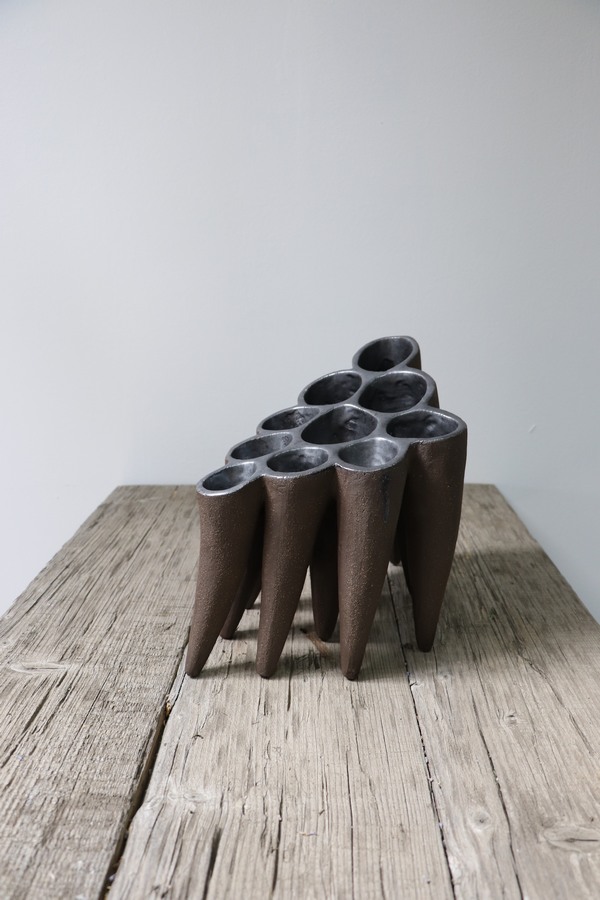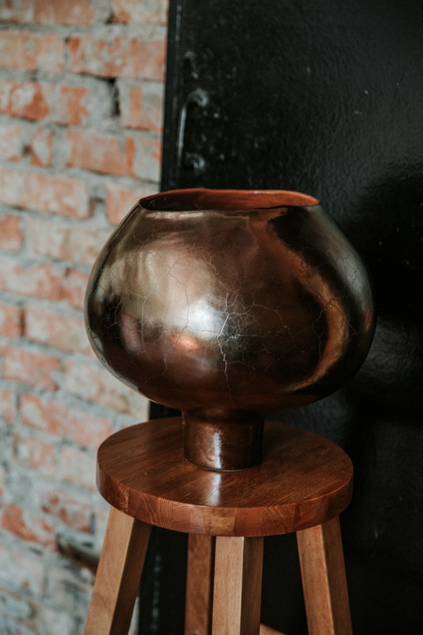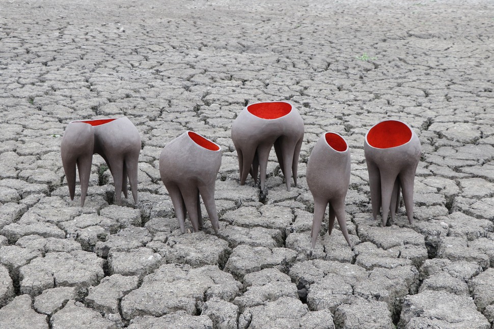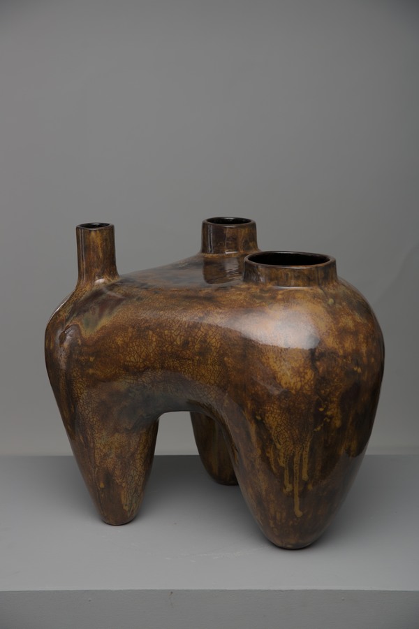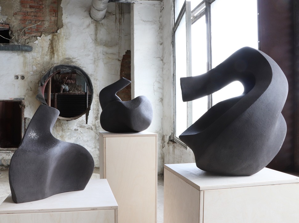 Очень интересно смотрятся габаритные напольные вазы, асимметричные — цвета тлеющих углей снаружи и огненно-красные внутри. В дизайне есть нечто магическое, шаманское, африканское, напоминающее природу, стихию.