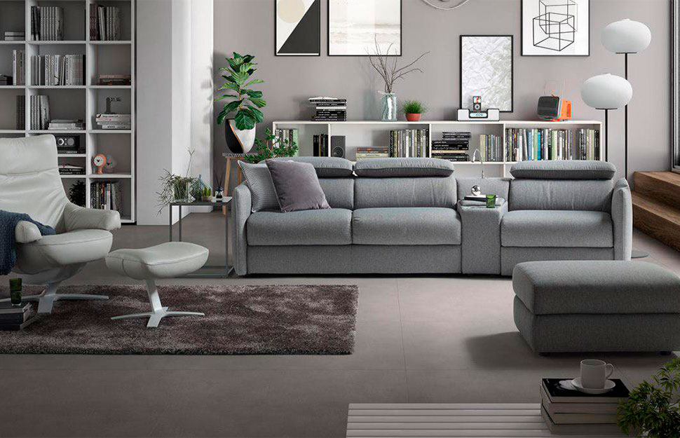 Диван Meragvilia отличается особой функциональностью: подголовники можно регулировать ручным способом, а спинку и сиденья – с помощью инновационной панели Motion, которая оснащена специальным сенсором для управления.