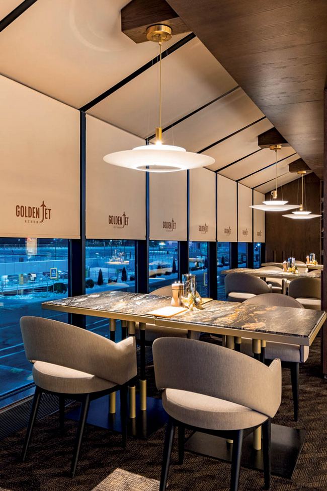 Компания SMARTLIGHT сделала совершенным интерьер гастрономической гордости Кишиневского аэропорта — ресторана Golden Jet. В качестве основного источника света служат дизайнерские люстры Flamingo испанской фабрики Vibia, работающие как точечный светильник и сочетающие в себе эффектную эстетику с функциональным дизайном.