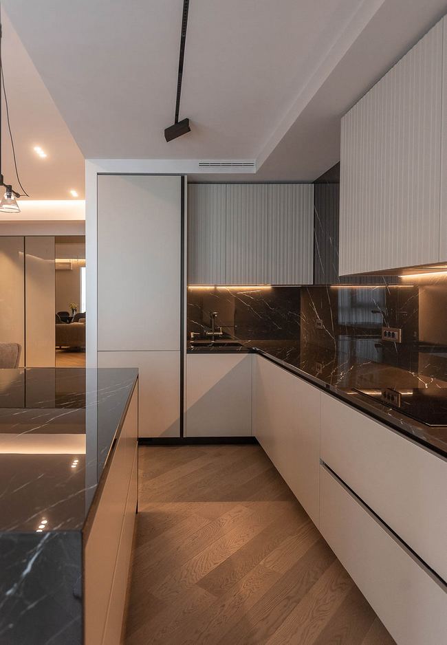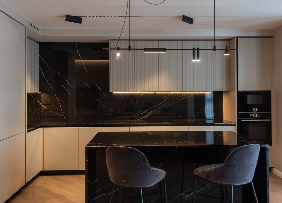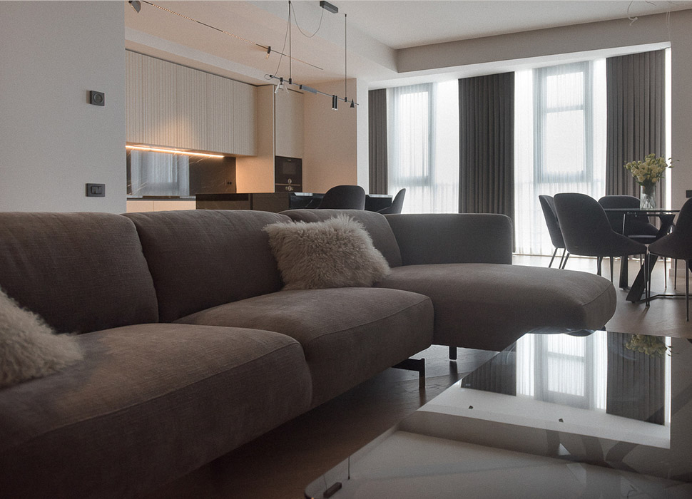 Тут решающую роль играют два фактора: продуманность интерьера и использованные материалы. Современный минимализм лишен роскошных предметов в общепринятом значении, но именно высокое качество материалов делает его не только практичным, но и респектабельным стилем. Акцентная стена из керамогранита на кухне придает этому интерьеру индивидуальность. К тому же мебель на кухне мы намеренно разместили асимметрично. Это ломает пространство и привлекает внимание. Природное тепло дарит древесина. Ее мы использовали в качестве напольного покрытия. В отделке стен использовали нейтральные и приглушенные оттенки. Мебель выбирали также базовых цветов. Это белый, черный, серый, коричневый. Сочетая светлые и темные оттенки, нам удалось грамотно разделить пространство. Мы установили несколько сценариев освещения, что в буквальном смысле позволяет менять интерьер в зависимости от настроения и случая. Особенно удачно в этом стиле интерьера смотрятся трековые системы освещения. Приглушенный или яркий, холодный или теплый свет помогает добиться эффекта недосказанности, интриги, таинственности интерьера.